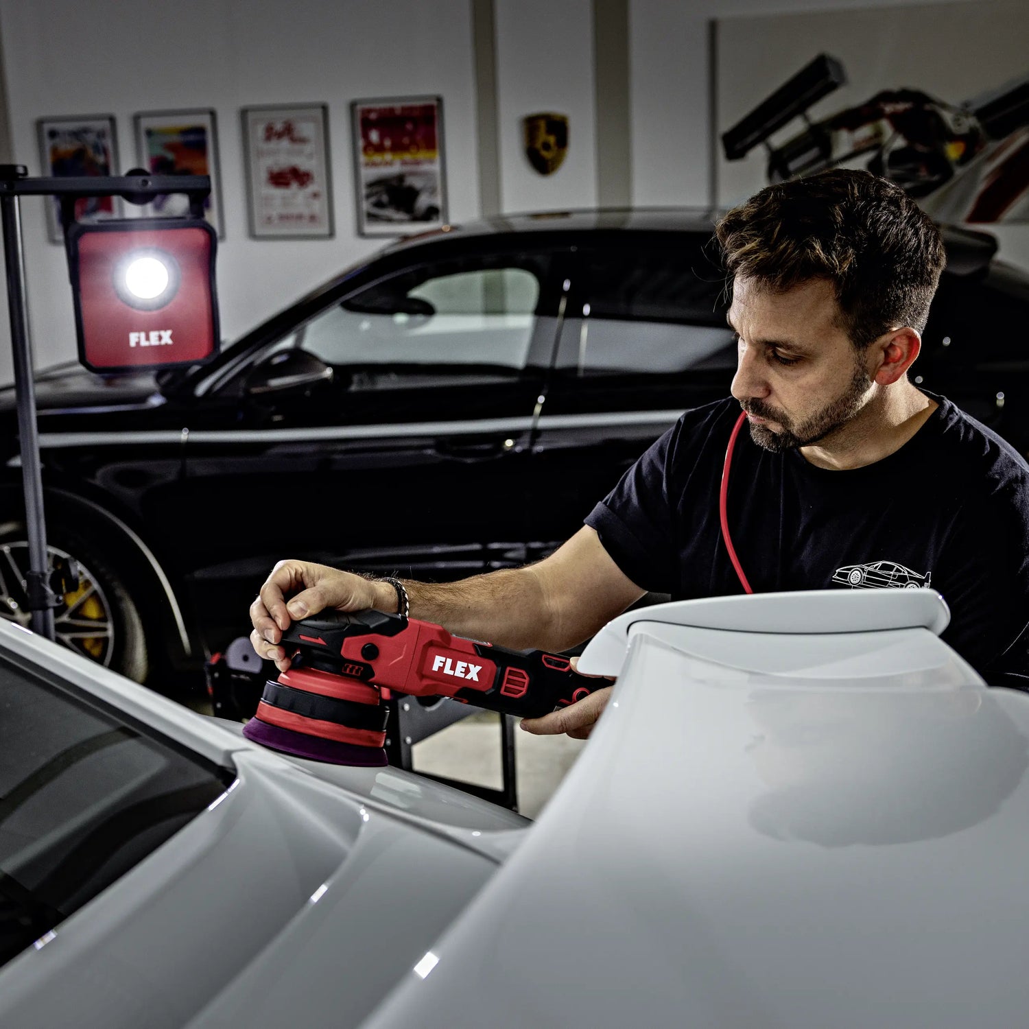 An 8 mm orbit eccentric polisher is considered a particularly versatile orbit size in detailing. While machines with a large orbit are more designed for surface coverage, the focus with 8 mm is clearly on control, precision, and uniform defect correction. This is precisely why the FLEX XCE 2 8 14-EC C is so popular with professional detailers looking for a machine for precise paint corrections and efficient one-step passes. In conjunction with suitable polishing pads and polishes, an enormous range of paint conditions can be treated – from classic swirl marks to more severely weathered paint surfaces. The precisely tuned speed range ensures controlled work throughout the entire polishing process. The microprocessor electronics maintain a constant speed, monitor temperature and load, and enable a gentle, controlled start of the machine. The result is very smooth polishing behavior with clear machine control. Especially during longer polishing passes or intensive corrections, this smooth operation becomes a decisive advantage because it supports fatigue-free work and simultaneously increases polishing precision.