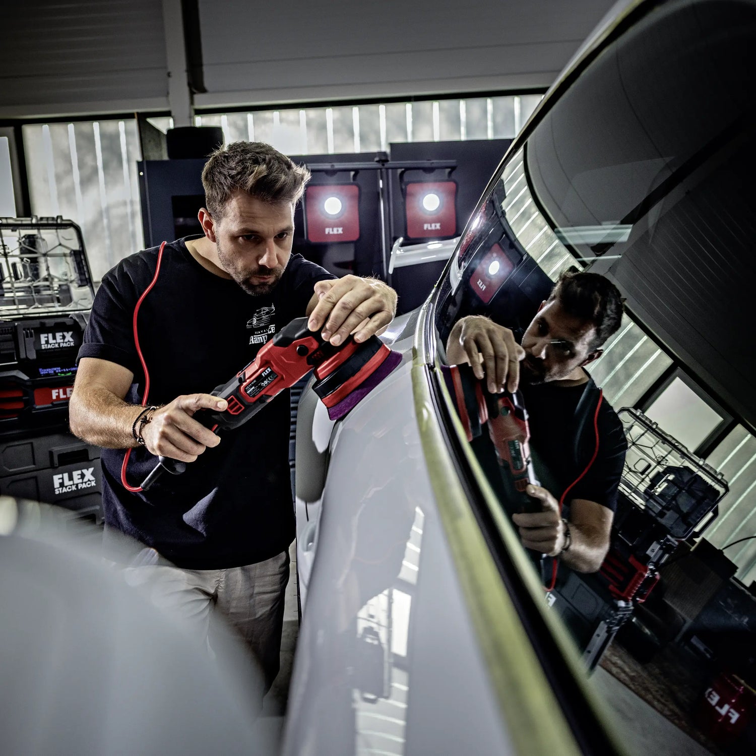 A forced rotation polishing machine combines two movement principles simultaneously: the eccentric orbital movement and a mechanically driven rotation of the backing pad. This exact system makes the FLEX XCE 2 8 14-EC C so interesting in professional detailing. While free-spinning eccentric polishers tend to lose their rotation under stronger pressure, the pad of a forced rotation polisher remains in constant motion. This results in significantly more uniform material removal and much more stable polishing performance. Especially on weathered paints, swirl marks, or classic signs of use, this technology ensures that the machine works reliably and effectively reduces defects. At the same time, the polishing pattern remains controllable because the eccentric movement significantly reduces typical rotary holograms. This combination of control and performance makes forced eccentric polishers so valuable in professional use. The user receives very direct feedback from the surface, can precisely dose pressure, and achieves reproducible results – regardless of whether working on flat doors, complex bumpers, or highly contoured fenders.