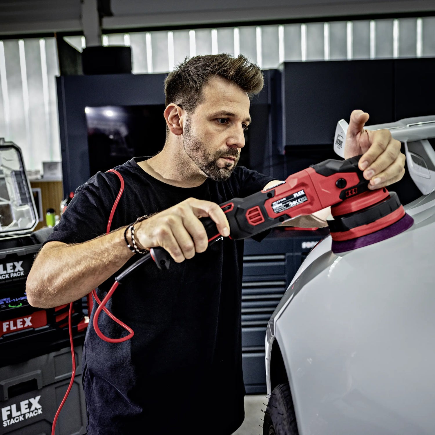 FLEX XCE 2 8 14-EC C is one of the most exciting machines for professional vehicle detailing: an 8mm eccentric polisher with forced rotation, combining the safety of an eccentric polisher with the correction power of a rotary machine. This precise blend makes it so popular in modern detailing. Instead of having to choose between aggressive defect correction and a safe finish, this machine gives you a tool that intelligently combines both worlds. Developed for professional use in detailing studios, paint shops, and reconditioning workshops, the corded polisher delivers consistent performance, controllable power delivery, and reproducible results – even on complex paint surfaces or with demanding defects.