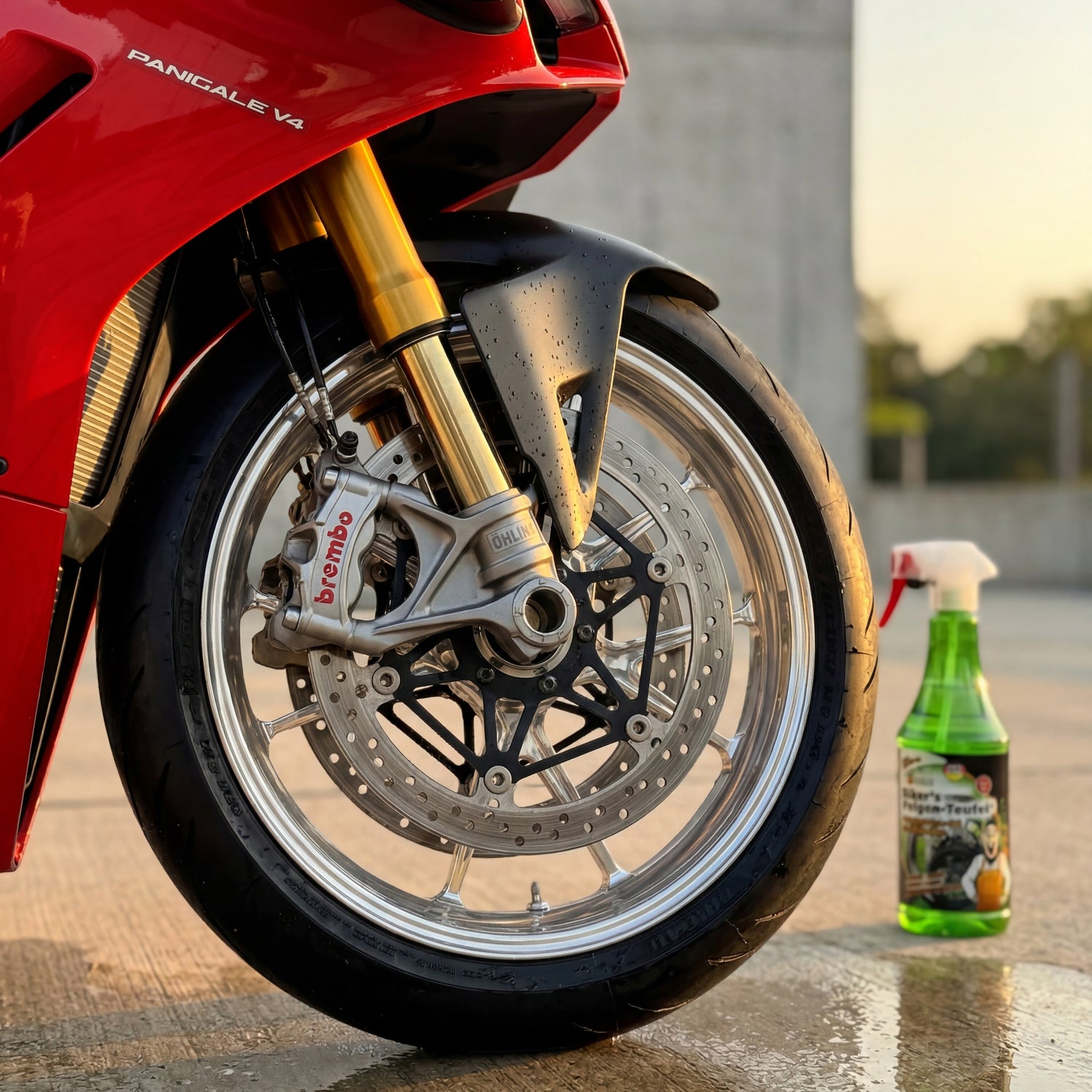 - Material-compatible without pH risk. Polished aluminum, painted aluminum, steel spokes, carbon, chrome – the pH-neutral formula is safe on the entire range of rim types. The only exception: For matte or anodized rims, test on a hidden spot first, especially on older motorcycles with already repainted rims.