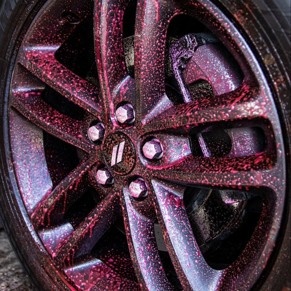 Die Anwendung des P21S POWER GEL Felgenreinigers ist einfach, aber wie beim professionellen Detailing sollte sie bewusst erfolgen. Sprühe das Produkt gleichmäßig auf die trockene, abgekühlte Felge. Durch die Gel-Haftung bildet sich sofort ein dünner Film, der auch an schwer zugänglichen Stellen haftet – zwischen Speichen, im Felgenbett oder hinter den Schrauben. Nach etwa 3–5 Minuten Einwirkzeit färbt sich der Reiniger dunkelrot bis violett: Das ist das Zeichen, dass Bremsstaub und Metallpartikel aktiv gelöst werden. Danach einfach mit einem kräftigen Wasserstrahl oder Hochdruckreiniger abspülen. Für ein perfektes Finish bei stark vernachlässigten Felgen kannst du mit einer weichen Felgenbürste leicht nachhelfen. Wichtig: nicht antrocknen lassen und nicht in der prallen Sonne anwenden. Da der Reiniger absolut säurefrei ist, bleibt das Risiko von Korrosion oder matten Stellen gleich null – selbst bei polierten Alufelgen oder empfindlichen Mehrteiler-Felgen. Er ist außerdem RDKS-kompatibel und biologisch abbaubar, also sicher im täglichen Einsatz. Nach der Reinigung empfiehlt sich eine Felgenversiegelung, um neuen Schmutz weniger haften zu lassen.
