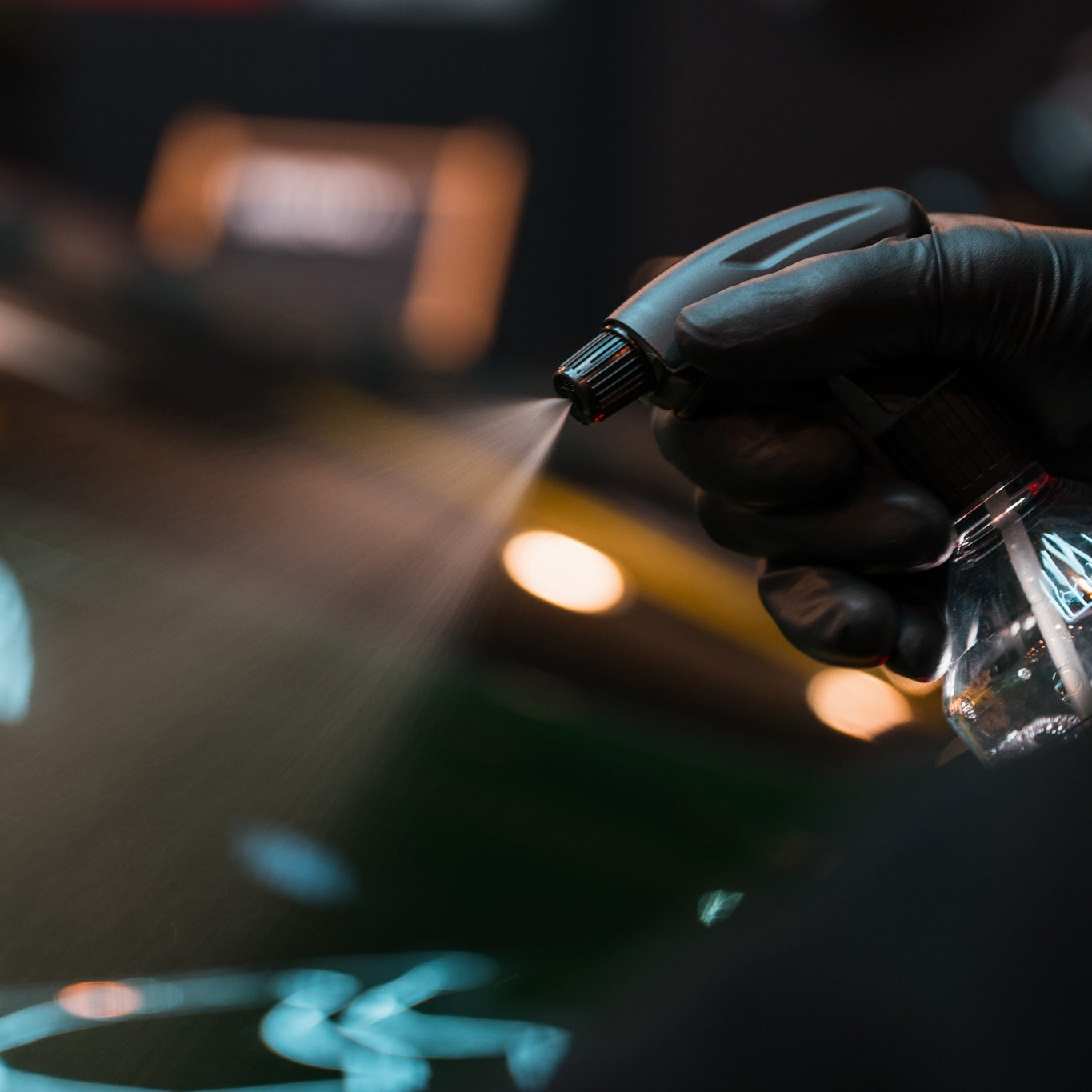 - Sprühe 2-3 Spritzer des Reinigers direkt auf die Glasfläche oder auf ein Mikrofasertuch.