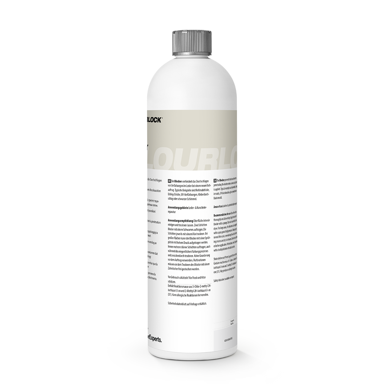 Nach der Anwendung bleibt die Lederoberfläche farbstabil und frei von wiederkehrenden Verfärbungen. COLOURLOCK Blocker eignet sich ideal für Automotive-Leder, Möbel, Taschen und Interieurteile mit bekannter Durchschlagsproblematik. Er ist kein Reiniger, kein Filler und kein Top Coat, sondern ein vorbereitendes Spezialprodukt, das zwischen Reinigung und Farbauftrag eingesetzt wird. Gerade bei hellen Ledern ist der Blocker entscheidend für ein dauerhaft sauberes Ergebnis.