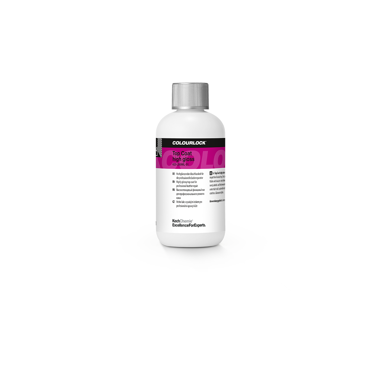 COLOURLOCK Top Coat (High Gloss) ist der intensiv glänzende Premium-Abschlusslack für farblich repariertes oder aufgefrischtes Leder. Er bildet einen hochtransparenten, spiegelglänzenden Schutzfilm, der die Farbschicht zuverlässig vor Abrieb, Schweiß, Reibung und täglicher Beanspruchung schützt. Die stark reflektierende Oberfläche sorgt für maximale Brillanz, tiefe Farbwirkung und ein besonders edles, poliertes Finish – ideal für dekorative Möbel, Designerstücke, Taschen, Accessoires oder glänzende Interieurflächen. Der Lack wird dünn aufgetragen und verläuft glatt, sodass ein klarer Spiegelglanz entsteht. In Kombination mit Crosslinker CD lässt sich die Haltbarkeit weiter erhöhen, während Soft Slip optional die Haptik verfeinert. High Gloss ist die richtige Wahl, wenn ein auffälliges, luxuriös glänzendes Endergebnis gefragt ist, das jede Reparatur sichtbar veredelt.