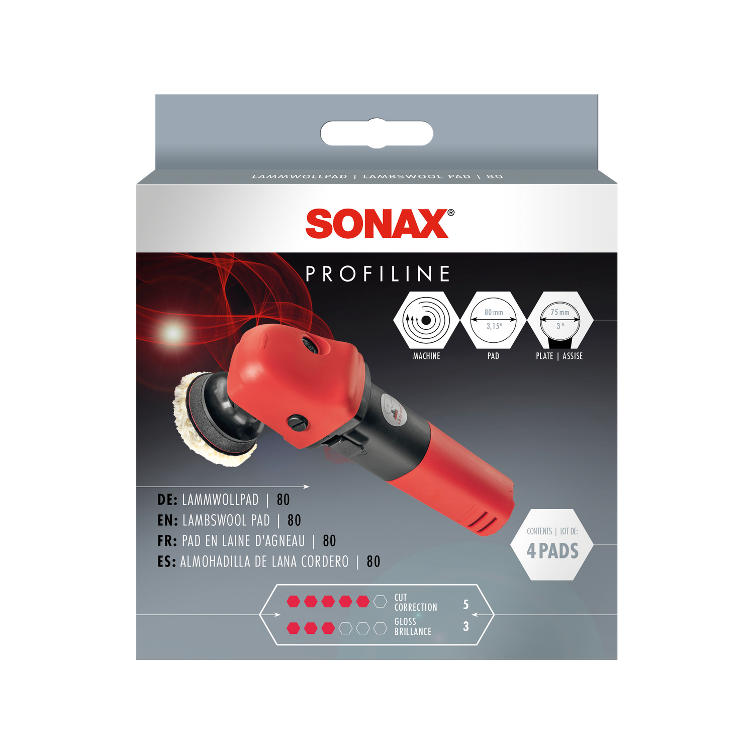 - Zwei Größen für verschiedene Maschinentypen — Ø80 mm und Ø125 mm. Der SONAX PROFILINE LammwollPad ist in Ø80 mm für den Einsatz auf kleineren Exzenter- und Rotationsmaschinen sowie in Ø125 mm für Standard-Rotationsmaschinen verfügbar. Der Ø80-mm-Pad eignet sich besonders für Details, Kanten und schwer zugängliche Bereiche, der Ø125-mm-Pad für die flächeneffiziente Bearbeitung von Hauben, Dächern und großen Karosserieflächen. Die Klett-Verbindung ist auf die SONAX PROFILINE Stützteller ausgelegt.