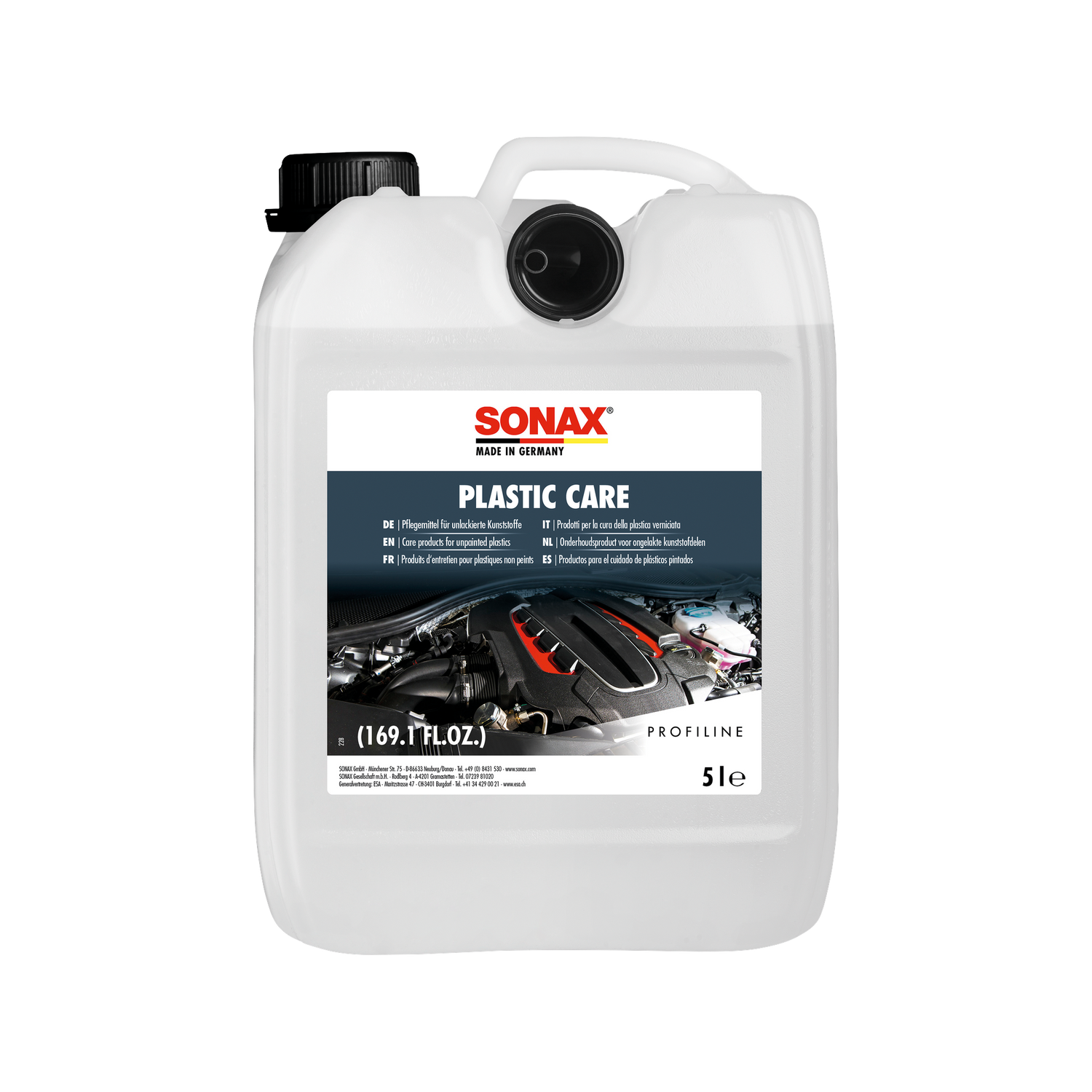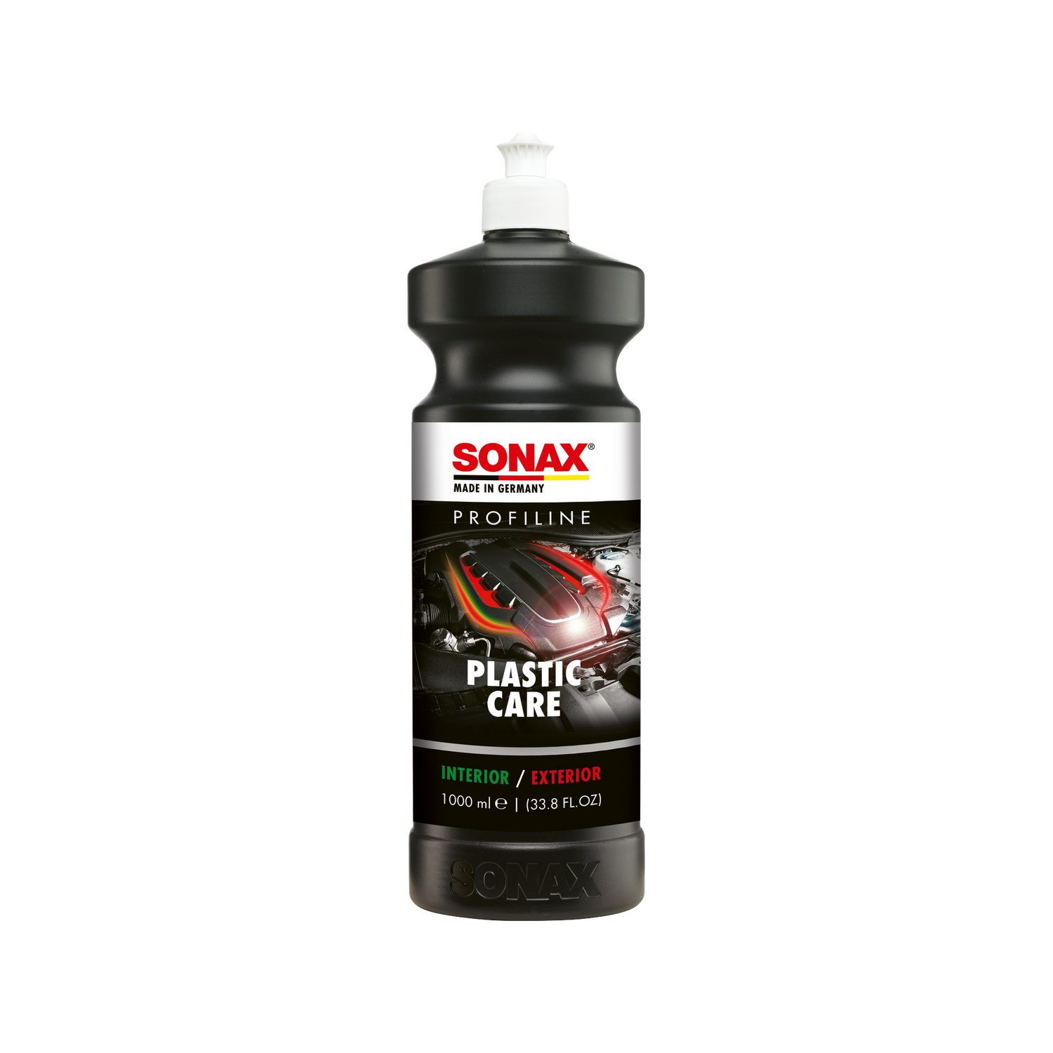 Was leistet die SONAX PROFILINE PlasticCare? Die lösemittelfreie Kunststoffpflege frischt verblasste Farben auf, kaschiert Vermattungen und oberflächliche Kratzer und konserviert alle Kunststoffteile im Fahrzeuginnen- und Außenbereich — inklusive Motorraumkonservierung direkt nach der Wäsche.